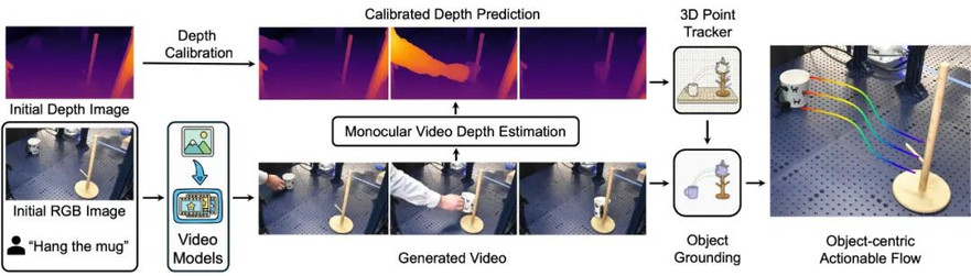 图 2:动作流生成器。从初始图像和文本提示生成视频,再通过一系列视觉模块将其提炼为以对象为中心的 3D 可执行流。