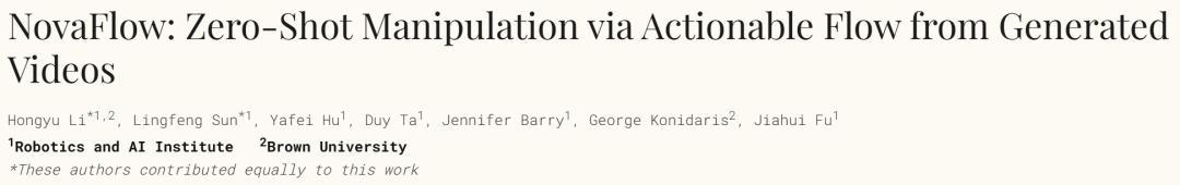 最近,来自布朗大学(Brown University)和机器人与人工智能研究所(Robotics and AI Institute,前波士顿动力人工智能研究所)的研究团队提出了一个全新的自动操作框架 NovaFlow。该方法另辟蹊径,不再要求通过机器人或者人类演示去收集数据,而是巧妙地利用了大型视频生成模型中蕴含的、源于互联网海量视频的 “常识” 知识。通过让机器人 “观看” 由视频模型生成的任务视频,并从中提炼出一种名为 “可执行 3D 对象流” 的任务表征,NovaFlow 成功实现了在无需任何真实演示或额外训练的情况下,让机器人零样本(Zero-Shot)完成复杂的操控任务。这项工作为通用机器人的实现提供了一条极具潜力的新路径。