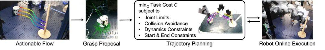 • 对于刚性物体(和铰接物体如抽屉):由于移动物体是刚性的,它的运动可以用一个简单的刚体变换(旋转和平移)来描述。执行器通过分析动作流中关键点的变化,计算出物体在每个时间步的 6D 位姿(位置 + 姿态)。然后,结合抓取位姿生成模型,计算出机械臂末端执行器需要达到的相应位姿序列,最后通过轨迹优化生成平滑且无碰撞的关节指令。
