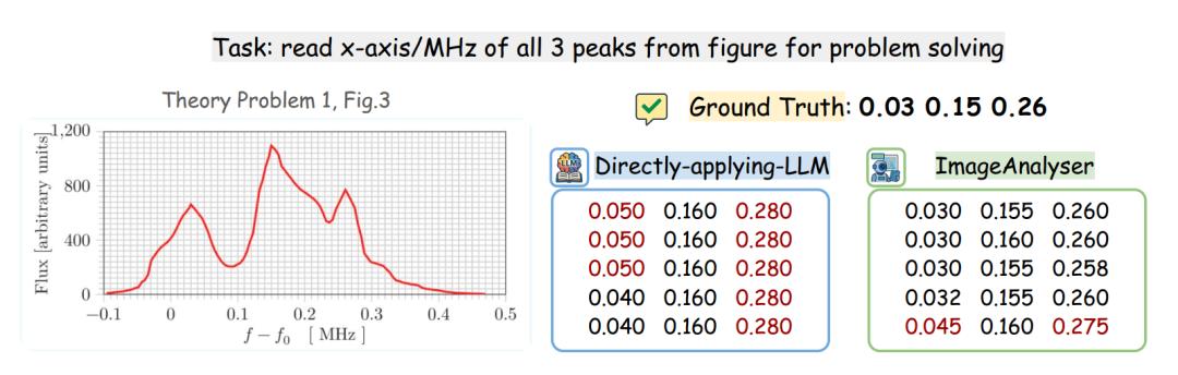 对于物理学家而言,解读实验结果、从图像中提取关键数据是十分重要能力。在部分物理奥赛题中,这甚至是解题过程的核心环节。然而,目前的 LLM 在图表、图像与示意图等视觉数据的精确测量方面仍存在不足。ImageAnalyzer 则会将高分辨率图像传递给专用的视觉语言模型,以执行精确的数值读取与测量任务。