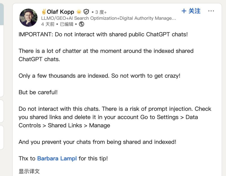 Aufgesang GmbH 联合创始人、首席业务发展官、SEO 和内容主管 Olaf Kopp 给出了建议。Olaf Kopp 在 LinkedIn 上指出,虽然只有几千条对话被编入索引,但他警告称,应避免与共享的公共 ChatGPT 聊天进行互动。