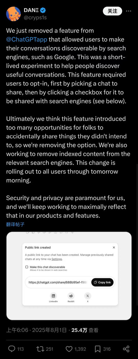 OpenAI 首席信息安全官 Dane Stuckey在 X 上 解释说,所有聊天记录被曝光的用户在选择分享聊天记录后,都会通过点击一个框来选择索引他们的聊天记录。