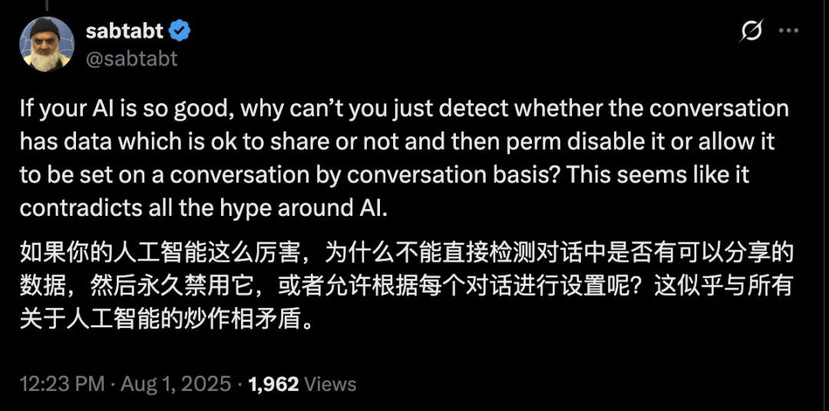 “要是你的人工智能真有那么厉害,那为什么不能直接检测对话中是否存在可分享的数据,然后对其永久禁用,或者允许根据每个对话进行相关设置呢?这似乎和所有关于人工智能的炒作都相矛盾。”