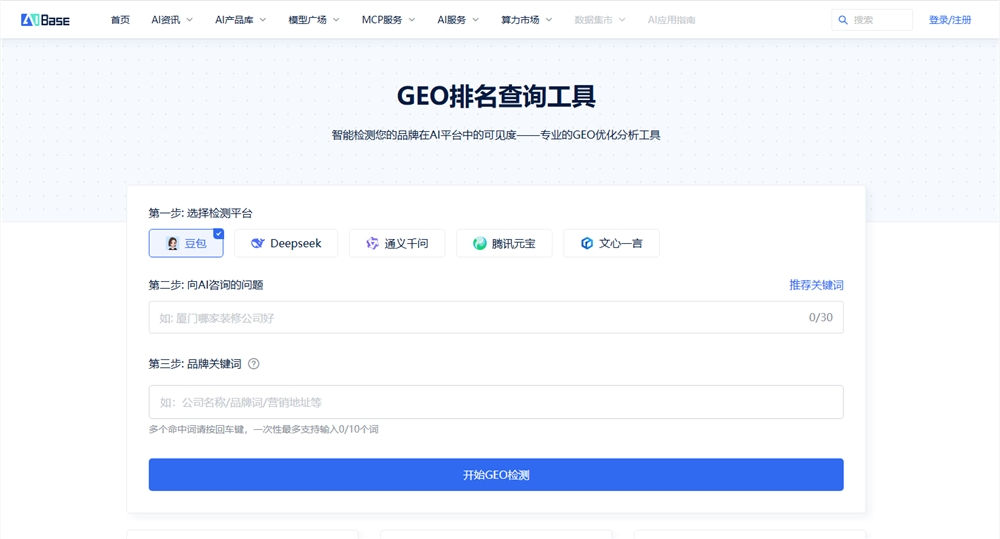 这时,专业的工具就显得至关重要。AIBase平台推出的「GEO排名查询工具」,正是为解决这一痛点而生。它是一款能够智能检测您的品牌在AI平台中可见度的专业分析工具。