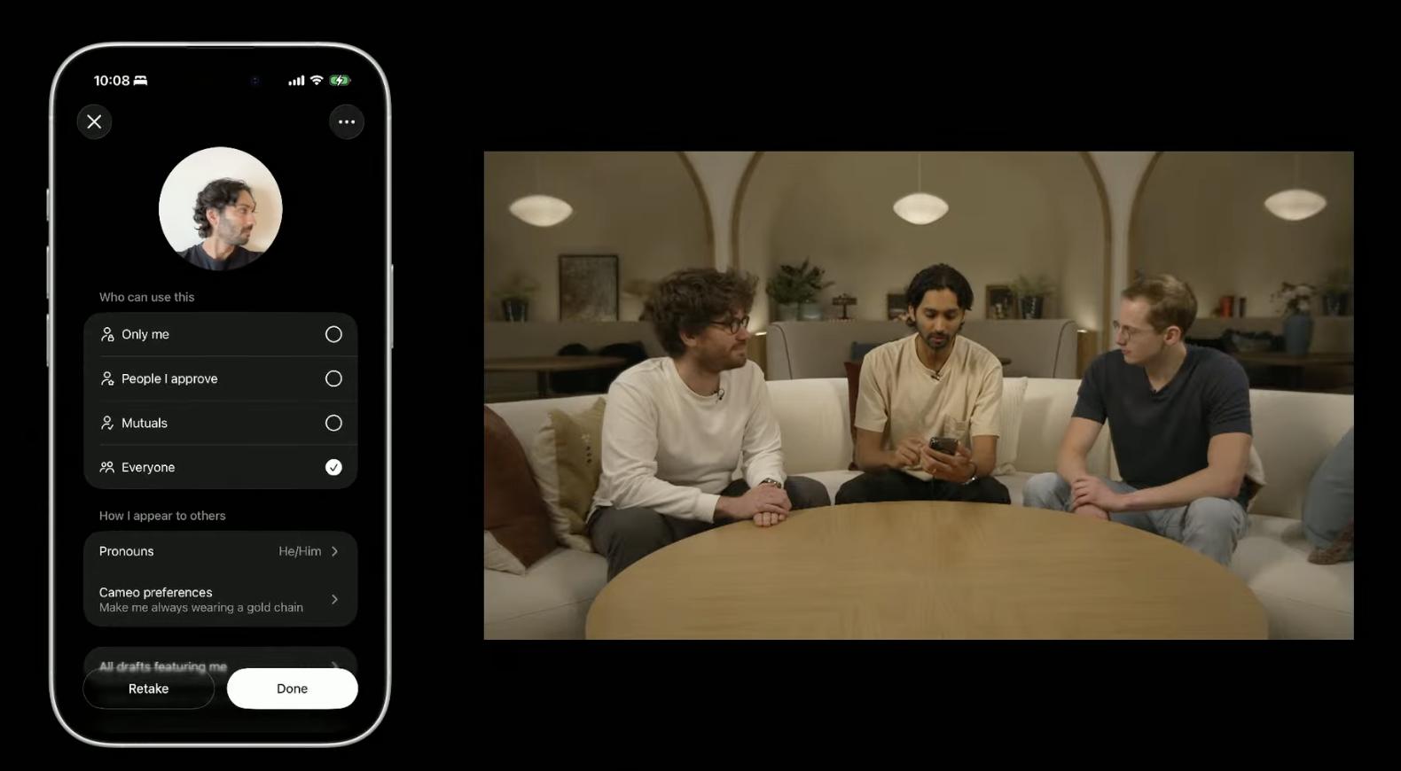 在客串功能方面,用户可以与Sora端到端地掌控肖像。只有用户本人才能决定谁可以使用自己的客串,并且可以随时撤销访问权限或移除包含该客串的任何视频。用户可以随时查看包含您客串的视频,包括其他人创建的草稿。
