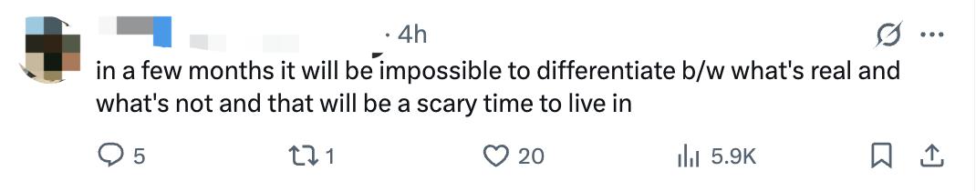 同时也有不少人感到担忧,X上的一位用户称:“几个月后,我们将无法区分什么是真实的,什么不是真实的,那将是一个可怕的时代。”