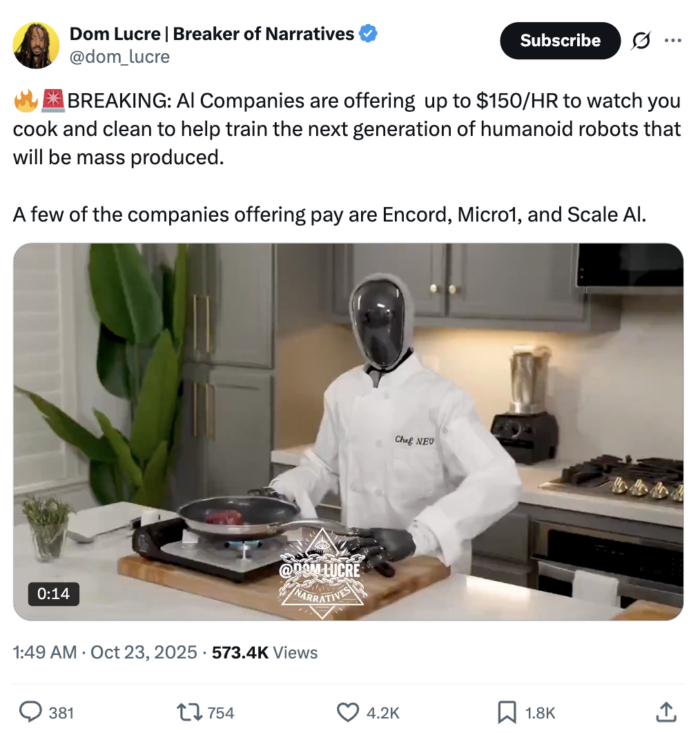 没错,这年头,你做家务的视频正被Encord、Micro1、Scale AI这些数据标注服务商当作训练人形机器人的人类高等素材,高价回收。
