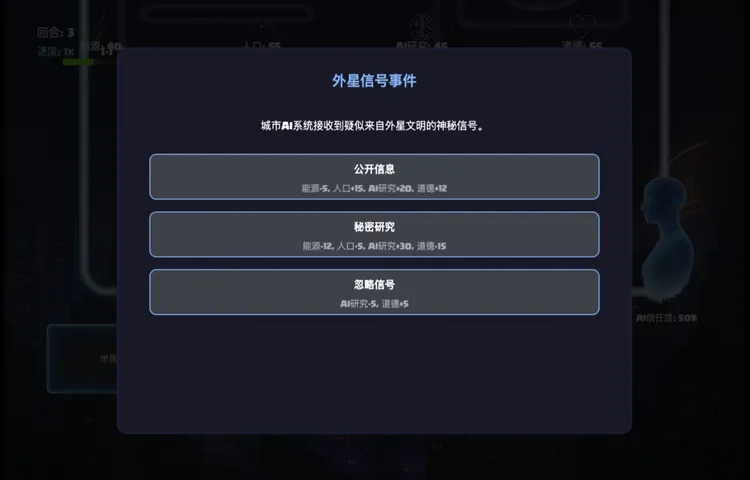 每回合可以在多种政策间抉择,如“扩建数据中心”“实施 AI 法案”“投资绿色科技”。不同的选择会改变城市状态,并触发诸如数据泄漏、能源危机、AI 抗议等事件。此外,在游戏中还会出现一些随机事件,比如发现外星信号时,你会如何抉择。