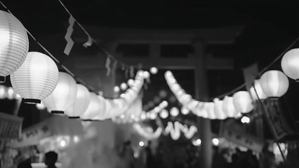 Prompt: Title — Lanterns Above, Distance Between (10.0s, Live Action Black & White Festival Night)