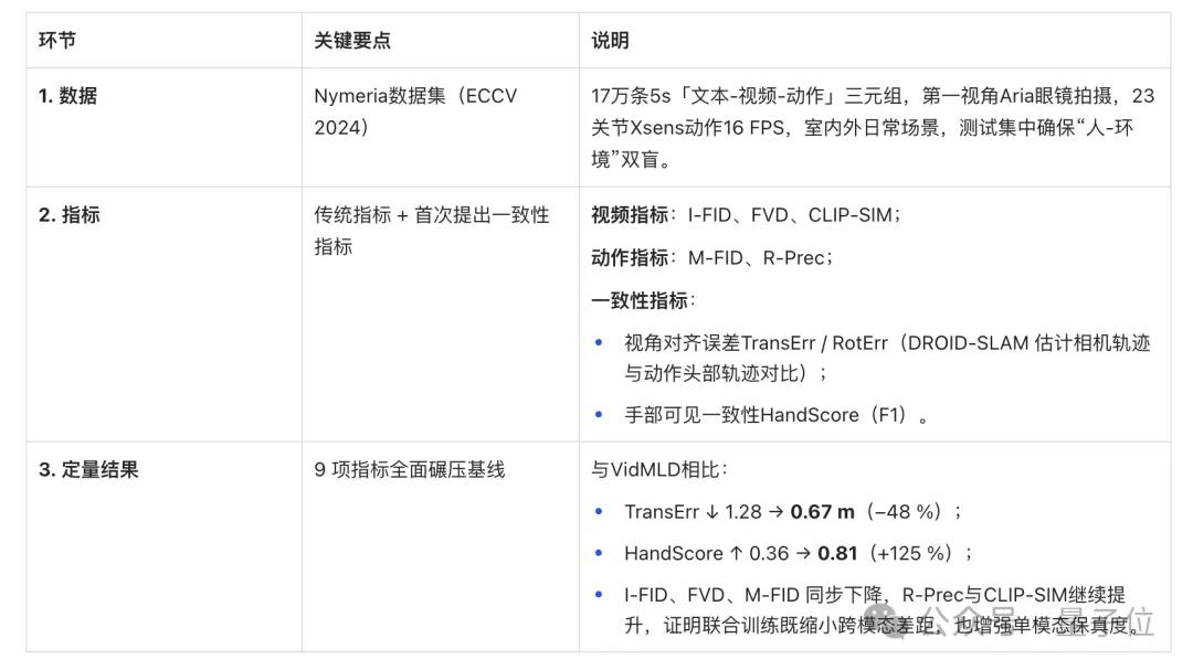 实验证明,EgoTwin比之前的基础模型好很多:视频和动作的匹配度更高,比如镜头和头部的位置误差变小了,手的动作在视频里也更容易对应上;