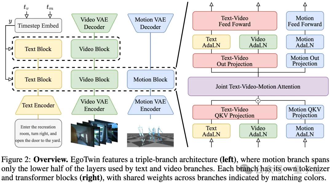 为解决上述挑战,EgoTwin基于扩散Transformer架构,构建了“文本-视频-动作”三模态的联合生成框架,通过三大关键设计实现突破两大难题。