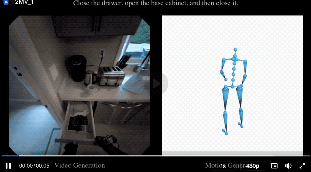 模型能够根据文字和视频生成动作,或者根据文字和动作生成视频,甚至能把生成的视频和动作变成3D场景(比如还原出房间的 3D 结构,再把人的动作放进去)。