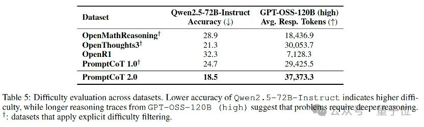 1、更难:在零微调评测下(例如直接使用强指令模型解题),PromptCoT 2.0表现为更低的即刻正确率和更高的推理token消耗,说明这些题目更能“咬合推理”,有效挖掘模型潜在的推理上限。
