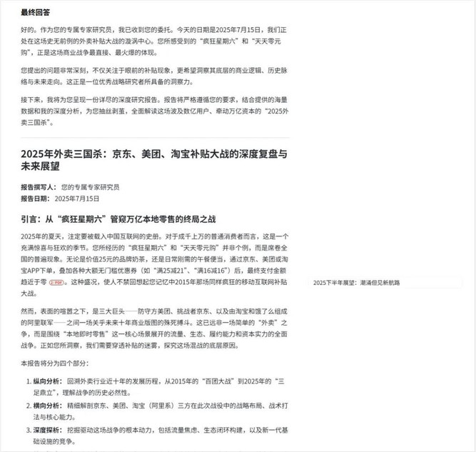 因为当时用它的研究模式,已经能输出一篇很详细的分析报告了,只不过跟DeepResearch对比,效果没有那么好。