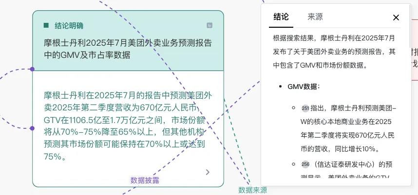 每一个节点的右上角,都有小角标,可以点开查看,如果是文字,就会在右侧跳出一个悬浮窗,告诉我这段搜索的具体结论。