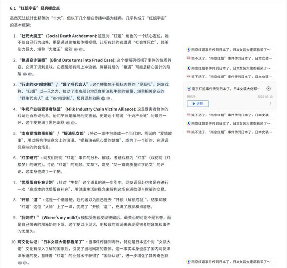 我只是让它搜红姐,结果他自己去找了三个播放量很高的视频来分析,然后还不满足,去扒了抖音、B站、微博关于红姐的内容,甚至离谱到去找了B站二创的TOP10完播率,这个联想能力还是有点酷的。