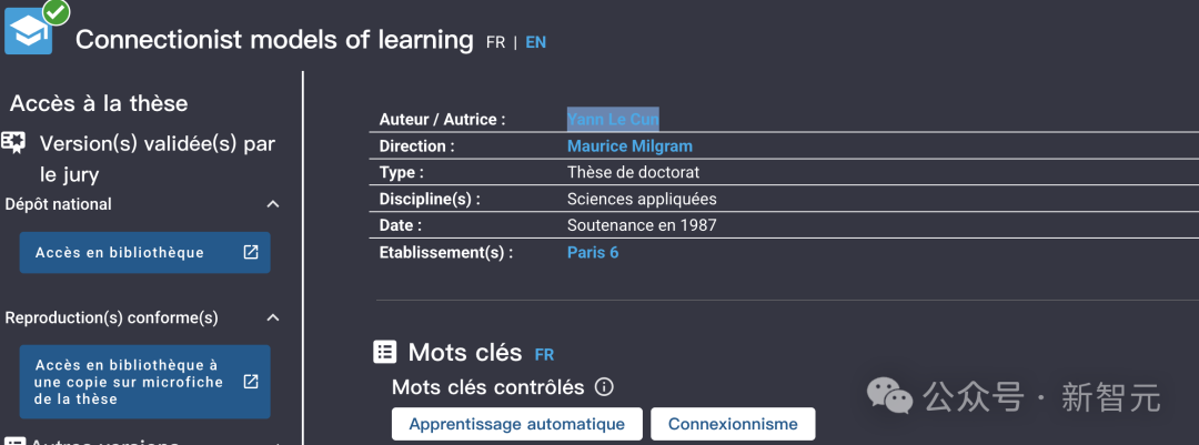 在1987年,他在现在的索邦大学(Sorbonne)获得博士学位,论文英文标题是《Connectionist Learning Models》「连接主义学习模型」。