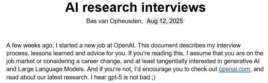 近日,一位入职 OpenAI 不到两个月的新研究员 Bas van Opheusden 分享了他的求职经历,面试指南长达 8 页。