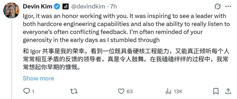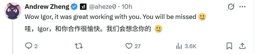 但不论如何,至少从 Igor Babuschkin 的离职长文中来看,他与 xAI 算是“和平分手”。不仅马斯克,许多 xAI 同事也纷纷留言,向 Igor Babuschkin 表达了祝福与感谢: