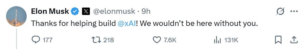 马斯克本人在评论区回应:“感谢你帮助打造 @xAI!没有你,我们不可能走到今天。”