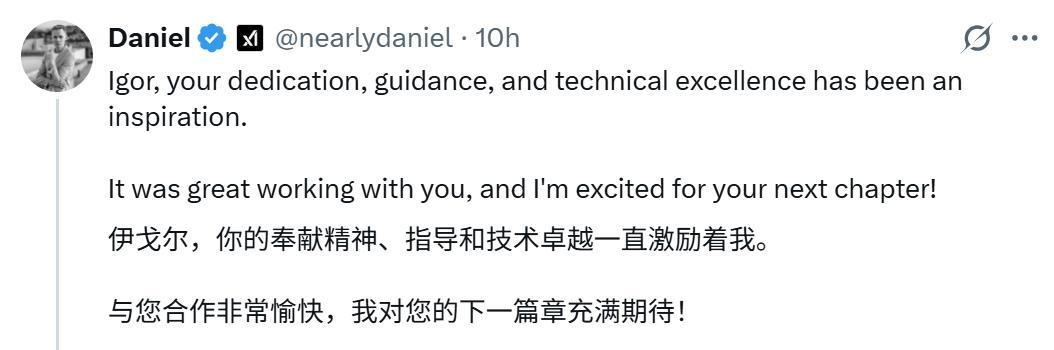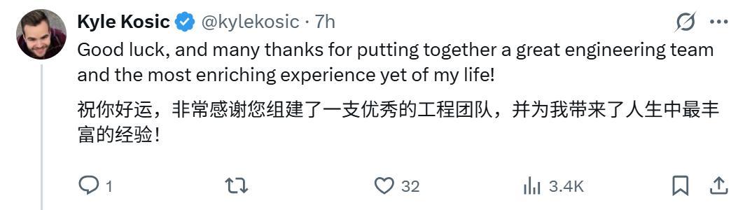 “xAI 的人是我合作过最投入的一群人。追上前沿不容易,这依赖于每个人的拼劲和团队精神。感谢你们的时间、付出和牺牲,我会永远记得那些熬夜奋斗的日子。”