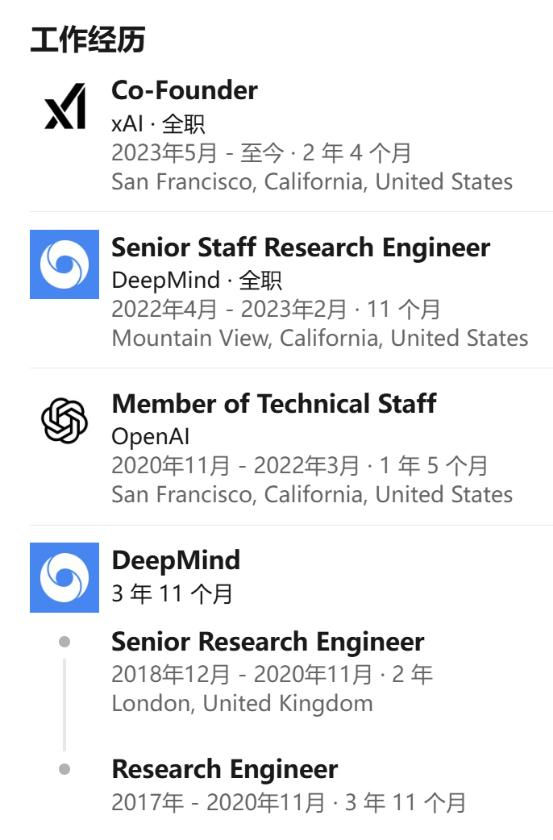 根据 LinkedIn 上的个人资料,Igor Babuschkin 在联合创立 xAI 之前,曾于 2017-2020 年在 Google DeepMind 担任了 3 年的研究工程师。期间,他参与了划时代的 AlphaStar 项目——该 AI 系统在 2019 年成功击败《星际争霸》顶尖职业玩家,被视为深度强化学习的一次重要突破。