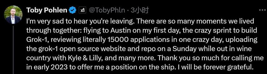 xAI的另一位联合创始人Toby Pohlen,在评论区表达了对Babuschkin离开的遗憾。他们二人一起经历了很多时刻:疯狂地开发Grok-1,1天之内审阅了大约15000份申请,周日一起加班上传Grok-1开源网站和代码库,还有许多其他时刻。