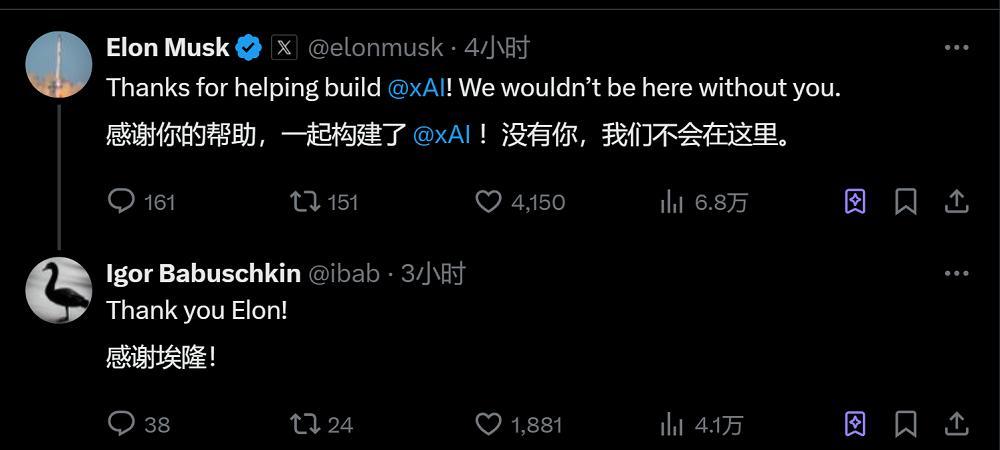 马斯克也在Babuschkin官宣离职的推文下认可了他对xAI的价值,马斯克称,没有Babuschkin就没有xAI的今天。