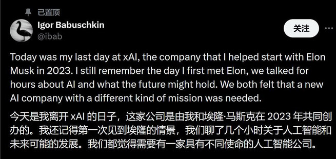 智东西8月14日报道,今天,马斯克旗下AI独角兽xAI的联合创始人Igor Babuschkin正式离开xAI。