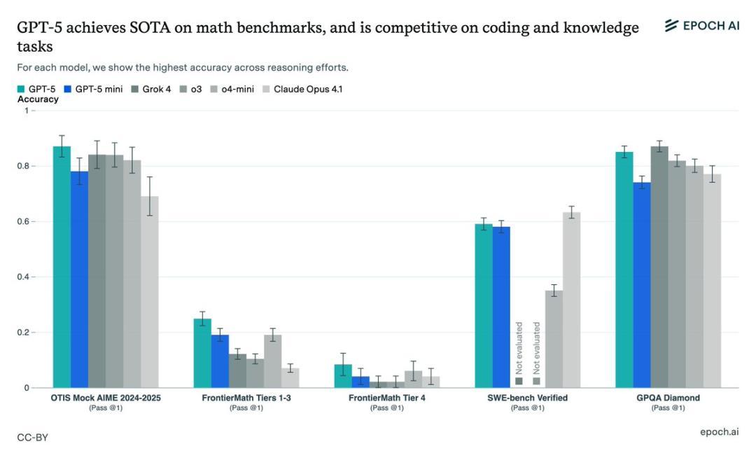 此外,在多个基准测试上,Epoch AI独立评估了GPT-5,表现非常亮眼: