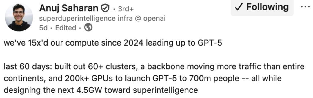 为了GPT-5,OpenAI的Anuj Saharan透露算力增加了15倍,动用超过20万块GPU,服务7亿用户。