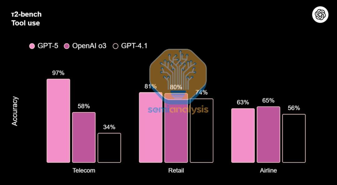 在GPT-5的发布说明中,你已经能看到未来商业化的投影:官方高调展示了Gmail、谷歌Calendar的集成,以及面向电信、零售、航空等行业的全新工具使用基准。