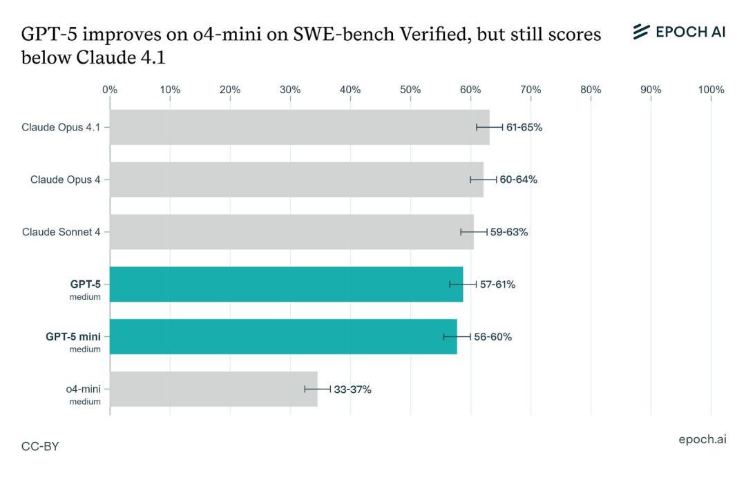 在编程测试SWE-bench Verified上,GPT-5进步明显,稍低于Claude 4系列;