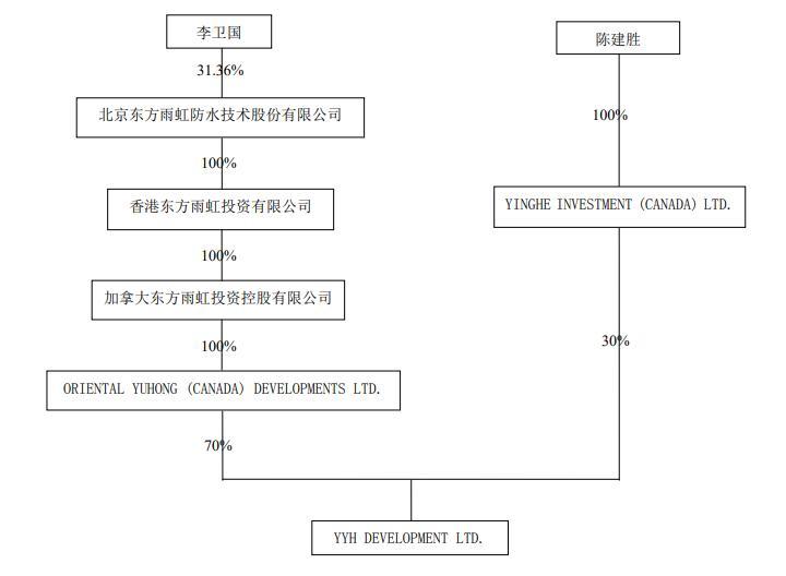 公告显示,标的公司成立于2016年3月,也在同一时间,标的公司与自然人陈建胜旗下公司YINGHE INVESTMENT (CANADA) LTD. 共同成立合资公司 YYH DEVELOPMENT LTD. 。而东方雨虹为双方合资公司约2.01亿元银行贷款,提供持股比例70%对应的贷款担保。