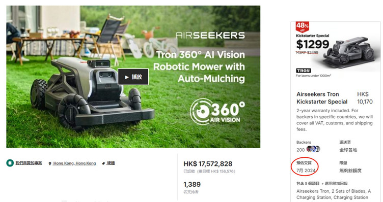 Kickstarter页面显示,产品预估交货时间为2024年7月(图源/Kickstarter)