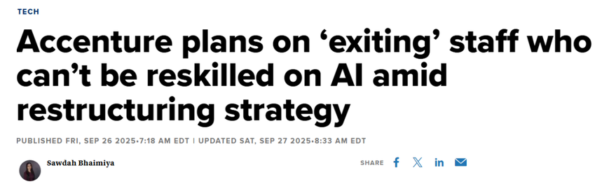 过去三个月,国际咨询公司埃森哲(Accenture)在全球范围内裁减了超过1.1万名员工。管理层计划继续裁掉无法掌握人工智能(AI)技术的员工,裁员行动预计持续到今年11月底。