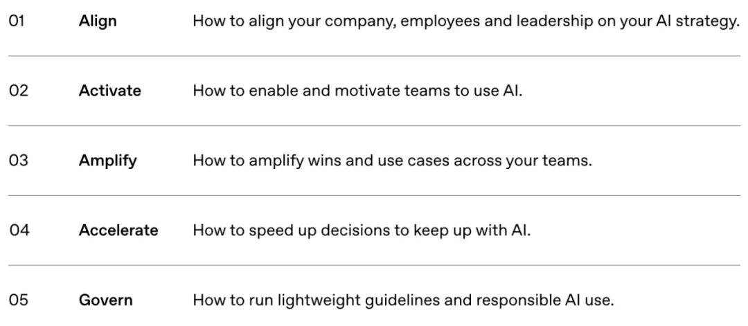 从中我们也可以提炼出 OpenAI 想要向领导者们传递的信息:对齐团队,激活培训,放大成功,加速决策,并负责任地治理。这些将成为企业在 AI 时代获得竞争优势的重要基础。