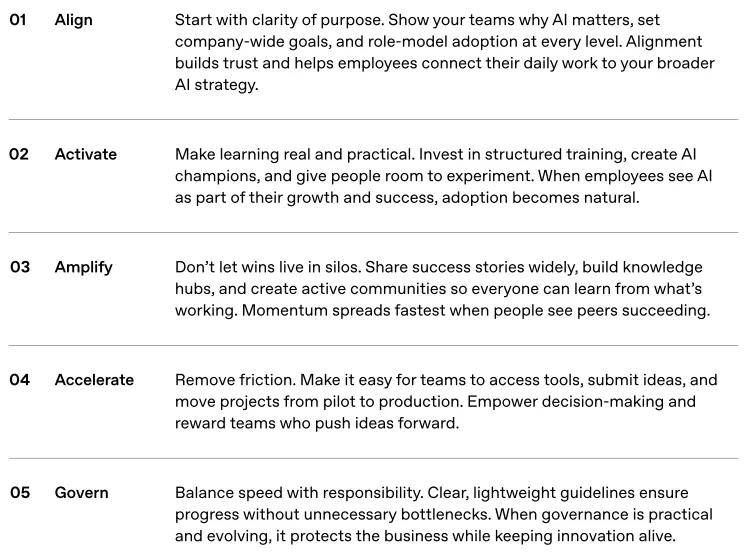 纵观整个报告,OpenAI 并非将 AI 视为一种辅助的工具,而是将其视为组织运作方式全面变革的基础。