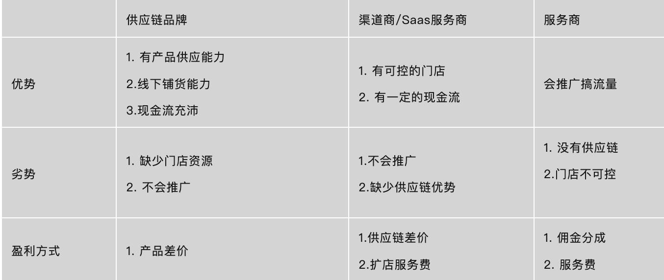 有供应链能力的品牌方通常会和渠道商或者服务商合作,一方面利用现有的门店资源,另外一方面使用服务商的线上推广能力,加快自己的产品推广。
