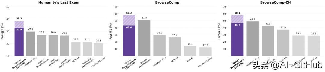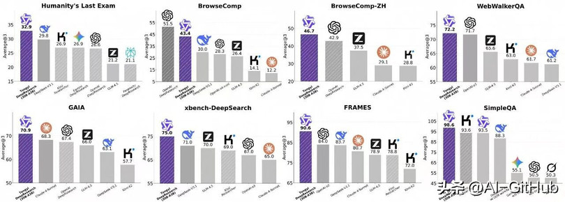 在 Humanity"s Last Exam、BrowseComp、BrowseComp-ZH、GAIA、xbench-DeepSearch, WebWalkerQA 以及 FRAMES 等多个 Benchmark 上,相比于基于基础模型的 ReAct Agent 和闭源 Deep Research Agent,其 30B-A3B 轻量级 tongyi DeepResearch,达到了 SOTA 效果。