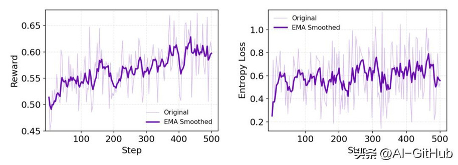 强化学习优化:基于GRPO算法定制,采用on-policy训练和token级策略梯度损失。通过留一法降低优势估计方差,并排除负样本(如过长未生成答案的样本)以提升稳定性。训练指标显示奖励持续上升,策略熵维持高水平,表明有效探索。