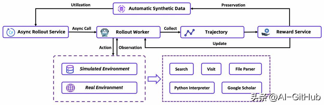 通义DeepResearch重新定义了Agent模型训练流程,建立新范式:Agentic CPT → Agentic SFT → Agentic RL,形成无缝端到端循环。