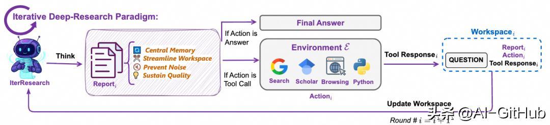 IterResearch范式:将复杂任务解构为独立“研究回合”。