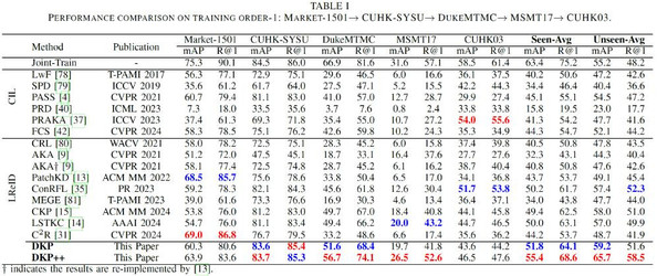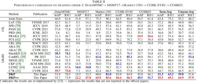 论文的实验采用两个典型的训练域顺序(Order-1 与 Order-2),包含五个广泛使用的行人重识别数据集(Market1501、DukeMTMC-ReID、CUHK03、MSMT17、CUHK-SYSU)作为训练域。分别评估模型在已学习域(Seen Domains)上的知识巩固能力和在未知域(Unseen Domains)上的泛化能力。评测指标采用行人 ReID 任务的标准指标:平均精度均值(mAP)和 Rank-1 准确率(R@1)。