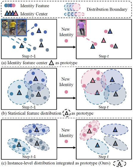 终身行人重识别任务的核心挑战是灾难性遗忘问题,即模型在学习新域知识后,对旧域中行人数据的检索性能大幅降低。为解决该问题,现有方法主要通过保留历史样本或采用知识蒸馏策略来缓解遗忘。然而,保留历史样本的方法存在数据隐私风险和存储开销持续增长的问题;知识蒸馏方法因强制新旧模型输出一致性,制约了模型的可塑性,限制了新知识学习能力。尽管原型学习技术在类增量学习任务中取得了较高性能,但现有方法仅为每个类别保留单一特征中心,忽略了类内分布差异,导致行人的细粒度知识丢失,难以适用于依赖细粒度匹配的终身行人重识别任务。