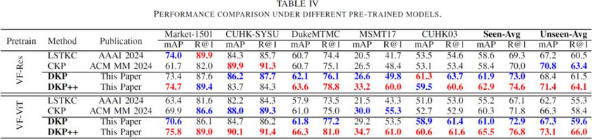 基础模型适配能力分析:在以不同的重识别基础模型(VF-Res,VF-ViT)作为预训练模型时,DKP++ 均保持了对现有方法的优势,说明其对不同的预训练模型均具备良好的适配能力。