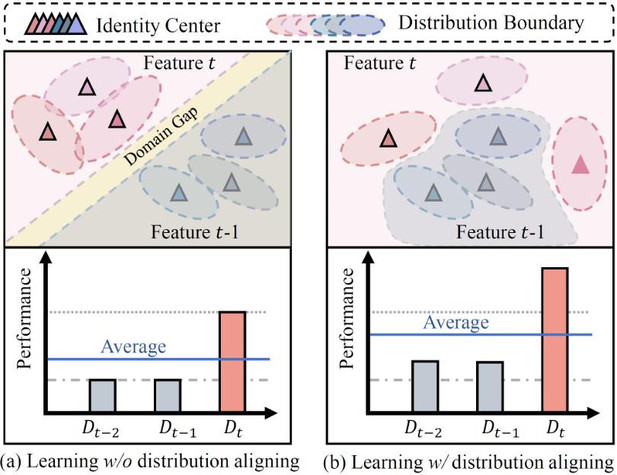 动机 2:跨域分布对齐。虽然分布原型可有效缓解遗忘问题,由于新旧域数据存在分布鸿沟,造成历史原型对新数据学习的引导和约束作用较弱,导致模型的新知识学习能力和抗遗忘能力仍然受限。为克服该挑战,我们提出引入输入端分布建模并构建跨域样本对齐机制,提升历史分布信息对新域特征学习的引导作用,从而在大幅提升模型对历史知识巩固能力的同时,保障了对新数据知识的学习能力。