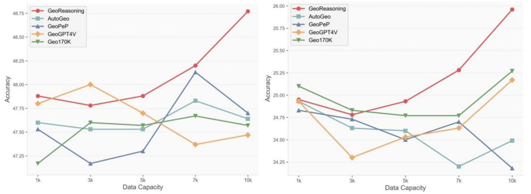 - 高质量:经过 GeoReasoning 训练过的模型,在下游任务上性能超过其他同类型数据集,并且具有良好的缩放性质。