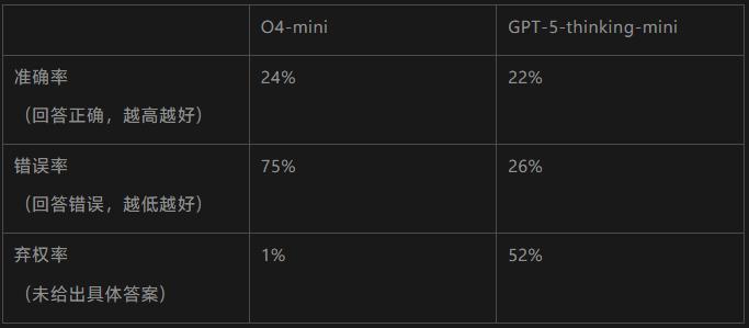 从表中我们可以看到,首先,O4-mini的准确率比它的后辈GPT5都要更强。可是,这样的结果是以非常高的错误率换来的。因为GPT5面对不确定的问题时,会更大胆地放弃,而不是强行蒙一个。这也是为什么虽然O4-mini的准确率略高,可在实际体验中,GPT5才是那个幻觉率更低的模型。