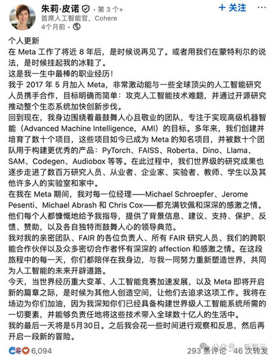 2025年4月,她在LinkedIn上宣布,自己将在5月30日正式离开Meta。宣布得低调,但时机敏感:刚好是在 Llama 4发布之前几天。